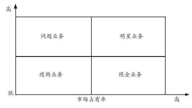 箱型矩阵也在横轴和纵轴上有一定的参数,它的特点是按照参数的大小和高低对4个空间进行分类。下面的图解是在市场营销中常见的产品组合管理矩阵,横坐标为市场占有率,纵坐标为市场成长率,按照箭头所指的方向,参数由低变高。右上方的业务,市场占有率高,市场成长率也高,有发展前景,是最有竞争力的业务,因此称为“明星业务”。右下方,市场占有率高,市场成长率低,继续保持高市场占有率就能取得高利润,可以称为“现金业务”。左上方,市场成长率高,市场占有率低,还处在发展阶段,经过调整很有希望提高市场占有率,所以称为“问题业务”。左下方,市场占有率低,市场成长率低,夺回市场的可能性很小,应该考虑退出市场了,那部分业务称为“瘦狗业务”。