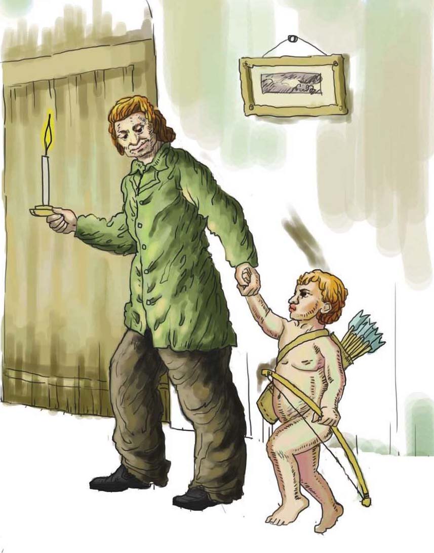 小家伙是一位美丽的天使,眼睛亮得像星星,手里拿着一把漂亮的弓。老诗人就抱他到膝上,把他的小手放到自己的手里暖着。小家伙马上恢复过来了,双颊也变得红润了,跳到地上来,围着这位老诗人跳舞。老诗人说小家伙的弓坏了,他想试试弓坏到什么程度,于是就插上一支箭,向这位和善的老诗人的心中射去,然后笑着跑了。