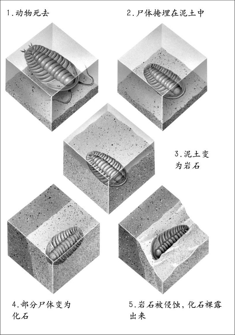 地层在漫长的地质年代一层层沉积的过程当中,也会将古代生物的遗体、遗物、生活遗迹或者印模等一起埋藏在地下,时间久了,这些遗体、遗物、生活遗迹或者印模等就会形成坚硬的石头,这被人们称为化石。不同生物化石的出现和地层的形成,有着平行的关系。也就是说,在越古老的地层中,挖掘出的化石所代表的生物,结构越简单,分类地位越低等。在距今越近的地层中,挖掘出的化石所代表的生物,结构越复杂,分类地位越高等。