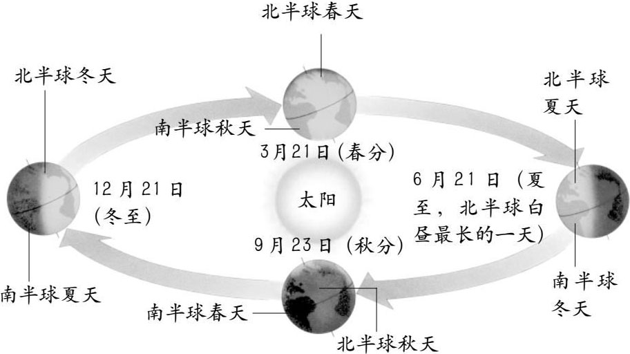 事实是这样的:每年3月21日左右,阳光直射赤道,这时太阳在春分点,北半球为春季。此后,太阳直射点逐渐向赤道以北移动,北半球所得的热量逐渐增多。每年6月22日前后夏至时,太阳光直射北回归线,北半球接受太阳光最多,这时北半球便是夏季。到9月23日前后秋分时,太阳光直射赤道,此时南北半球接受太阳光相等,北半球便是秋季。秋分后,太阳光直射点移到南半球,到12月22日前后冬至时,太阳光直射南回归线,北半球接受太阳光最少,这时北半球便是冬季。地球不停地公转,春、夏、秋、冬四季便不断地交替出现。