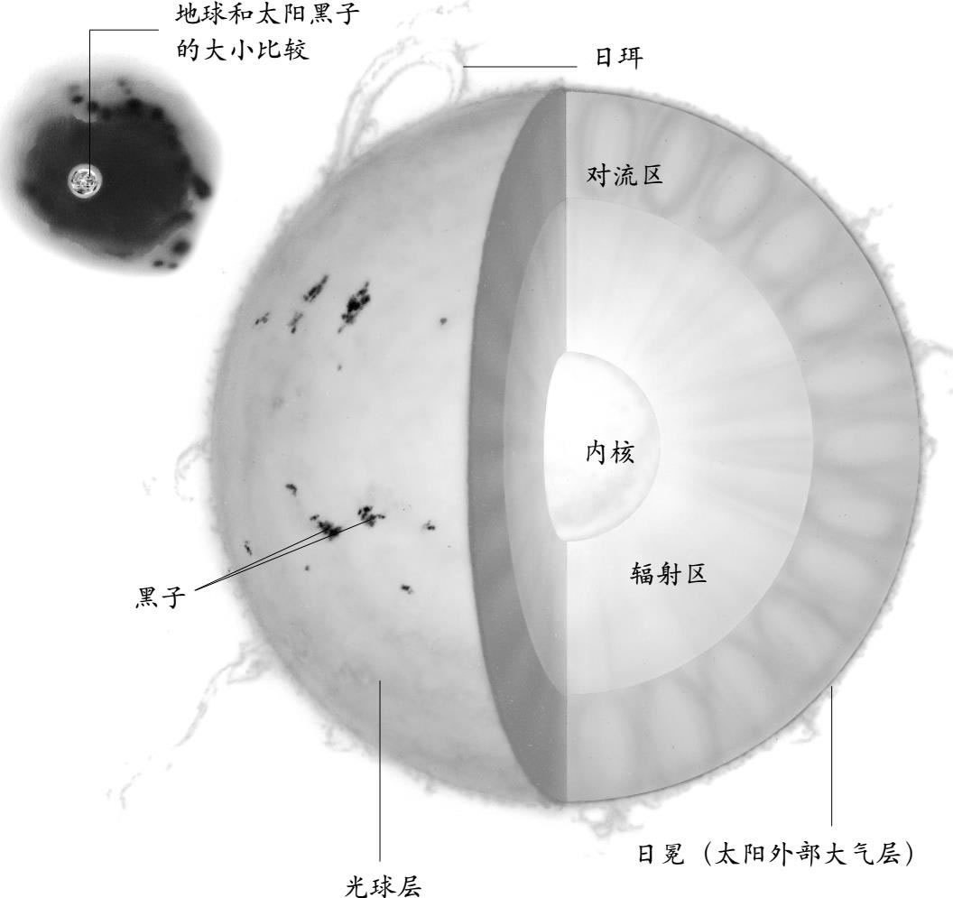 太阳的内部构造从中心向外,依次是核反应区、辐射区和对流区。太阳的表层人们习惯称为“太阳大气”,由里向外依次为光球层、色球层和日冕层。