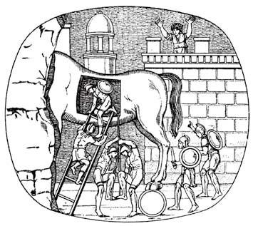 伊利昂城最终被攻破了。说起来,这还是另一位希腊英雄奥德修斯的功劳。奥德修斯让人造了一架硕大无朋的木马,把它留在战场上。特洛伊人兴高采烈地把这个大家伙当战利品拖进城中,他们哪里会想到,木马肚子里埋伏着希腊勇士呢。到了夜间,伏兵从马肚子里杀出来,跟城外的希腊大军里应外合,打破了坚固的伊利昂城。——“特洛伊木马”也便成了熟在人口的典故。
