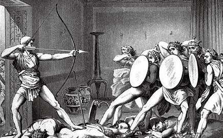 经历十年战争、十年漂泊,此时的奥德修斯看上去简直就是个又老又脏的乞丐。离家二十年,家里也早已不成样子。人们都以为奥德修斯死了呢,一大群王孙贵族整天缠着他的妻子,赖在宫中大吃大喝。幸而他的妻子忠贞不渝,他的儿子也已长大成人。妻子为了摆脱求婚者的纠缠,搬出奥德修斯的弓箭,说是谁能不偏不斜射穿十二把斧子的斧眼儿,她就嫁给谁。