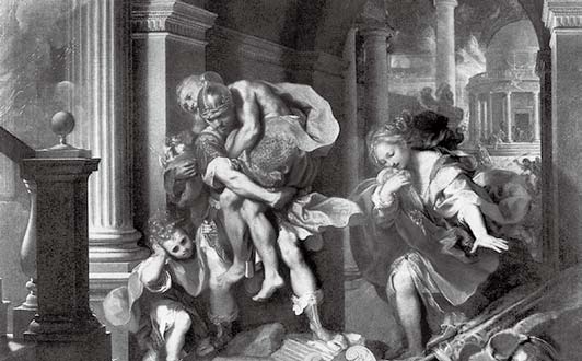 罗马最著名的史诗《埃涅阿斯纪》,记录的就是这位始祖的事迹。说起来并不陌生,埃涅阿斯是伊利昂城老王的女婿。伊利昂城让希腊人焚毁后,埃涅阿斯率特洛伊残部乘船逃往海上。