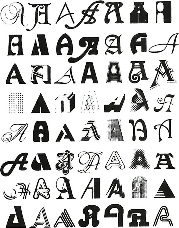 事实上,对喜欢琢磨范畴丰富性的人来讲,字体集是个不折不扣的金矿。在A图中,我们收集了字母A的不同写法。稍加观察,便可清楚地知道,人们可能事先想到的任何一种A的写法,都会与某种或多种字体相悖。然而每种字体都很容易识别,就算在A单独出现时人们无法轻易识别它,那在有上下文的时候一定可以毫不费力地将其辨认出来。