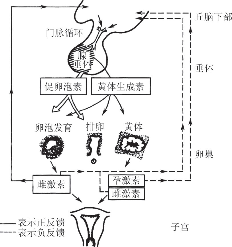 卵泡排出卵子后形成黄体。在LH作用下,黄体逐渐发育,分泌孕激素和雌激素,孕激素使子宫内膜由增殖期变为分泌期。当黄体成熟时,孕激素、雌激素达到高峰。大量雌孕激素通过负反馈作用,使垂体分泌的LH减少,黄体开始萎缩,雌孕激素骤然减少,子宫内膜失去性激素支持发生脱落出血,月经来潮。雌孕激素分泌的减少,使下丘脑-垂体所受的抑制解除,FSH分泌又开始增多,下一月经周期重新开始,如此周而复始,直至卵巢功能衰退,最终月经停止。