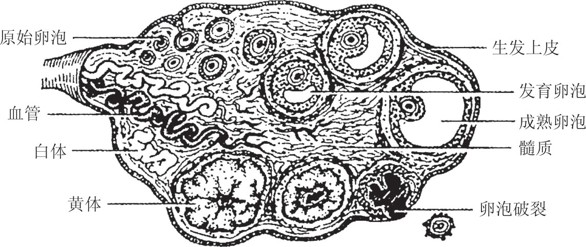 卵巢表面无腹膜,由单层立方上皮覆盖称生发上皮,其内有一层纤维组织称卵巢白膜,白膜下为卵巢实质,分皮质与髓质两部分。皮质在外层,其中有数以万计的原始卵泡(又称始基卵泡)及致密结缔组织;髓质在中心,无卵泡,含疏松结缔组织及丰富的血管、神经、淋巴及少量的平滑肌纤维(图2-5)。