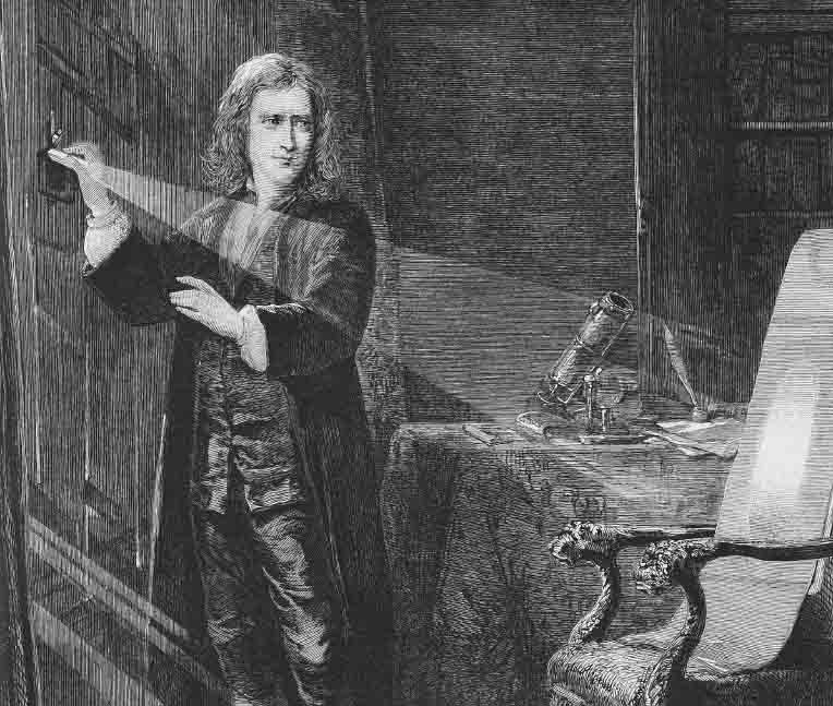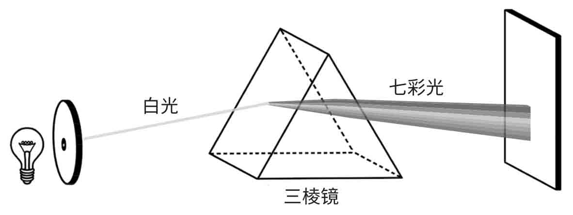 色散实验是牛顿所做的有名的实验之一。实验的情景在一些科普读物里被渲染得令人印象深刻:炎热难忍的夏天,牛顿却戴着厚重的假发待在一间小屋里。窗户全都被封死了,所有的窗帘也被拉上,屋子里面又闷又热,一片漆黑,只有一束亮光从一个特意留出的小孔射进来。牛顿不顾身上汗如雨下,全神贯注地在屋里走来走去,并不时地把手里的一个三棱镜插进那个小孔里。每当三棱镜被插进去的时候,原来的那束白光就不见了,而在屋里的墙上映射出一条长长的彩色宽带:颜色从红一直到紫。这当然是一种简单得过分的描述,不过正是凭借这个实验,牛顿得出了白色光是由七彩光混合而成的结论。