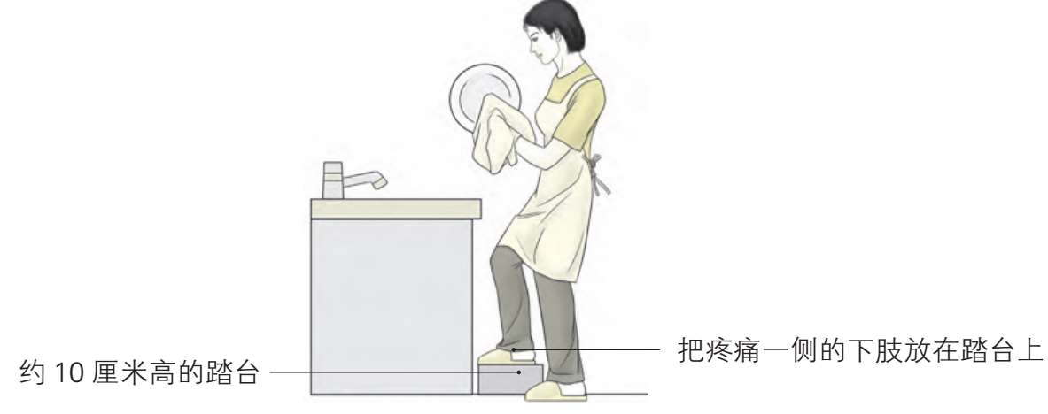 洗碗时,把疼痛一侧下肢放在适当高度的踏台上,可减轻患肢的疼痛。