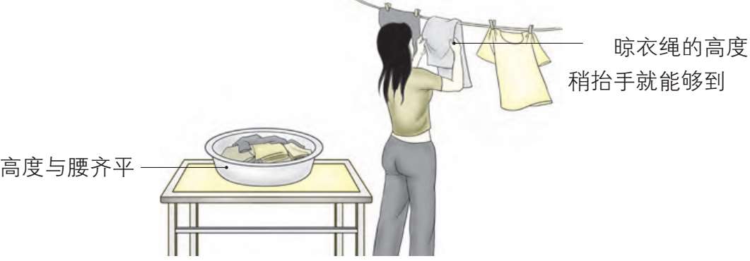为了避免重复弯腰动作,可把洗好的衣服放在较高的位置。晾衣绳也不要太高,以免踮脚对下肢造成伤害。