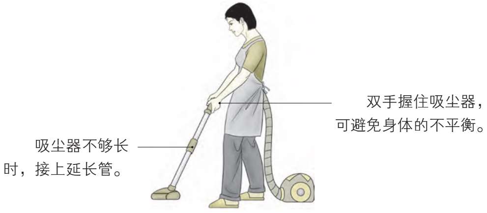 选择足够长的清洁用具,可避免弯腰对下肢和腰部造成的伤害。做清洁工作时,还要注意身体的平衡。