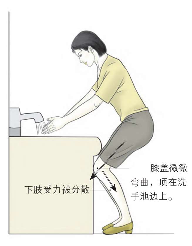 在餐厅或工作单位的洗手间洗脸、洗手时,可以微微屈膝,用膝盖顶着洗手台,这种姿势能有效地分散体重,不会对腰部造成过大的负担。