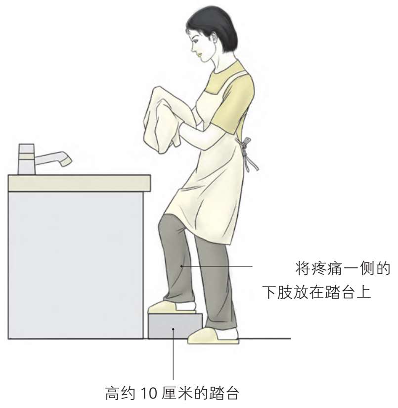 在洗漱台前放一个10厘米高的踏台,洗漱时将疼痛一侧的下肢放在踏台上,这种方式不仅可以减少对下肢的伤害,还可以起到保护腰部的作用。