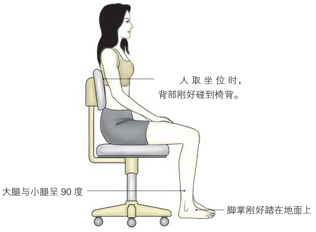 理想的椅子高度应该是:坐在椅子上,膝盖弯曲成90度时,脚掌刚好可以踏在地板上。如果膝盖还没弯到90度,脚就已经踏到地板,说明椅子太低;如果膝盖弯到90度时,脚还没有踏到地板,说明椅子太高。