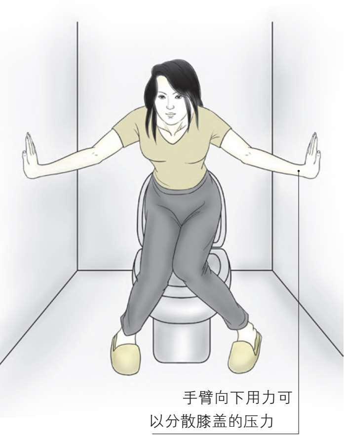 选择蹲式马桶,光是蹲的姿势,就会给膝盖和下肢带来很大的负担。特别是起身的时候,所用的力气比坐式马桶要大很多。因此建议选用蹲式马桶的家庭改用坐式马桶,尤其是慢性膝痛的患者更要如此。目前市场上有一种非常方便的马桶座,只要把这种马桶座覆盖在蹲式马桶的上面,就可以使之变成坐式马桶。