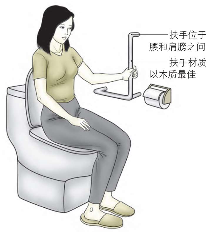 人从下蹲到站起的过程中,会对膝盖造成很大的负担,所以,如果厕所装有扶手,起身时要借助扶手慢慢站起;如果没有扶手,要用手扶着墙壁慢慢站起来。理想的扶手位置是坐在马桶上就可以轻松够到,位于腰和肩膀之间为最佳高度。