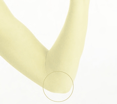 手臂弯曲,以手肘来施力能产生固定及较强的力度。尤其在脊椎两侧等较难指压的地方,手肘是最佳的工具。只是当你用体重来施力时,可能会过度用力,所以开始时要慢慢地施力,再依所需逐渐加强力度。