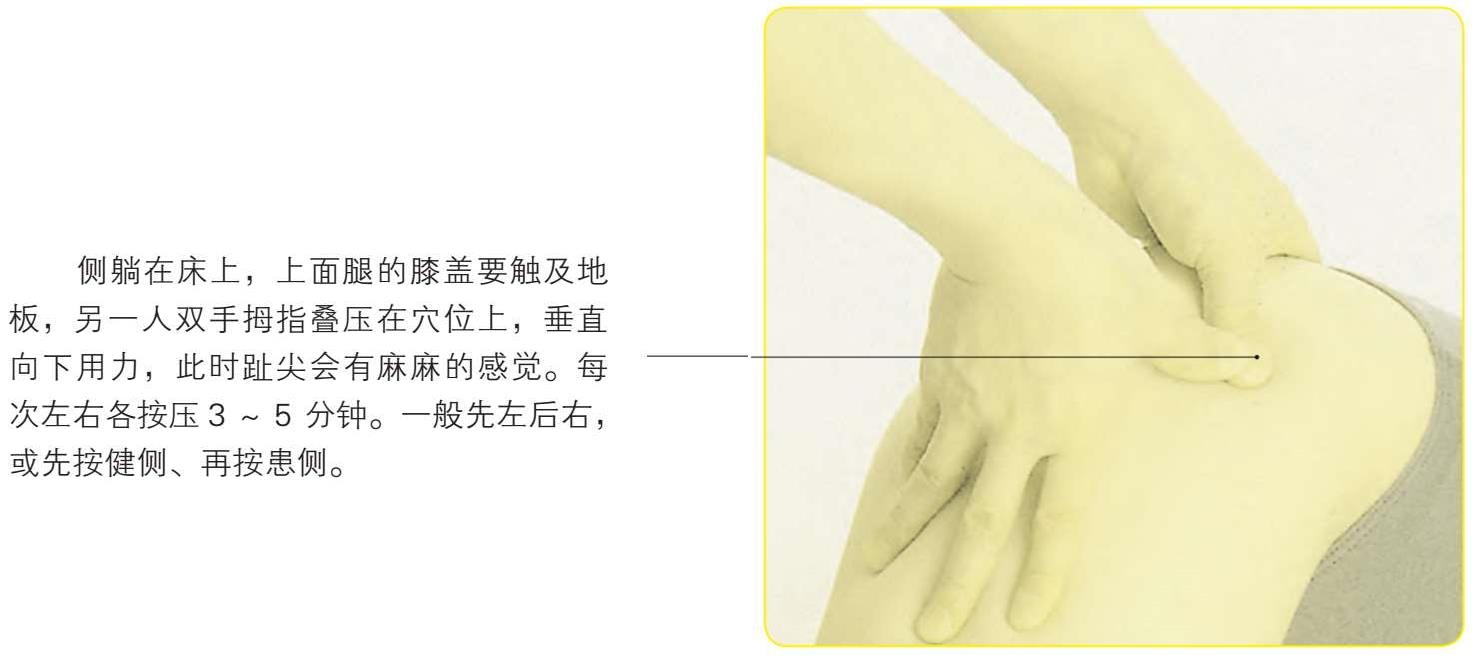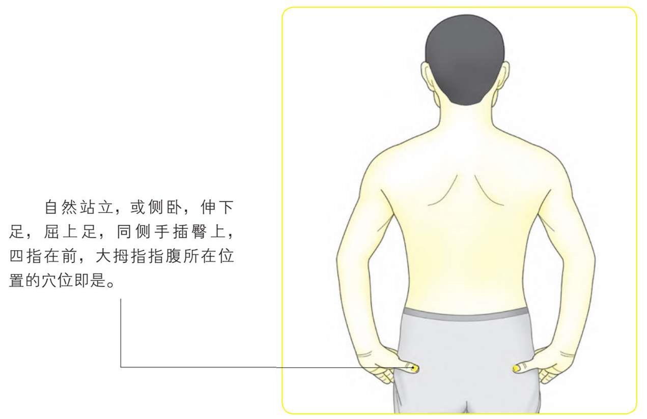 位置:在股外侧部,侧卧屈股,当股骨大转子最凸点与骶管裂孔连线的外1/3与中1/3交点处。