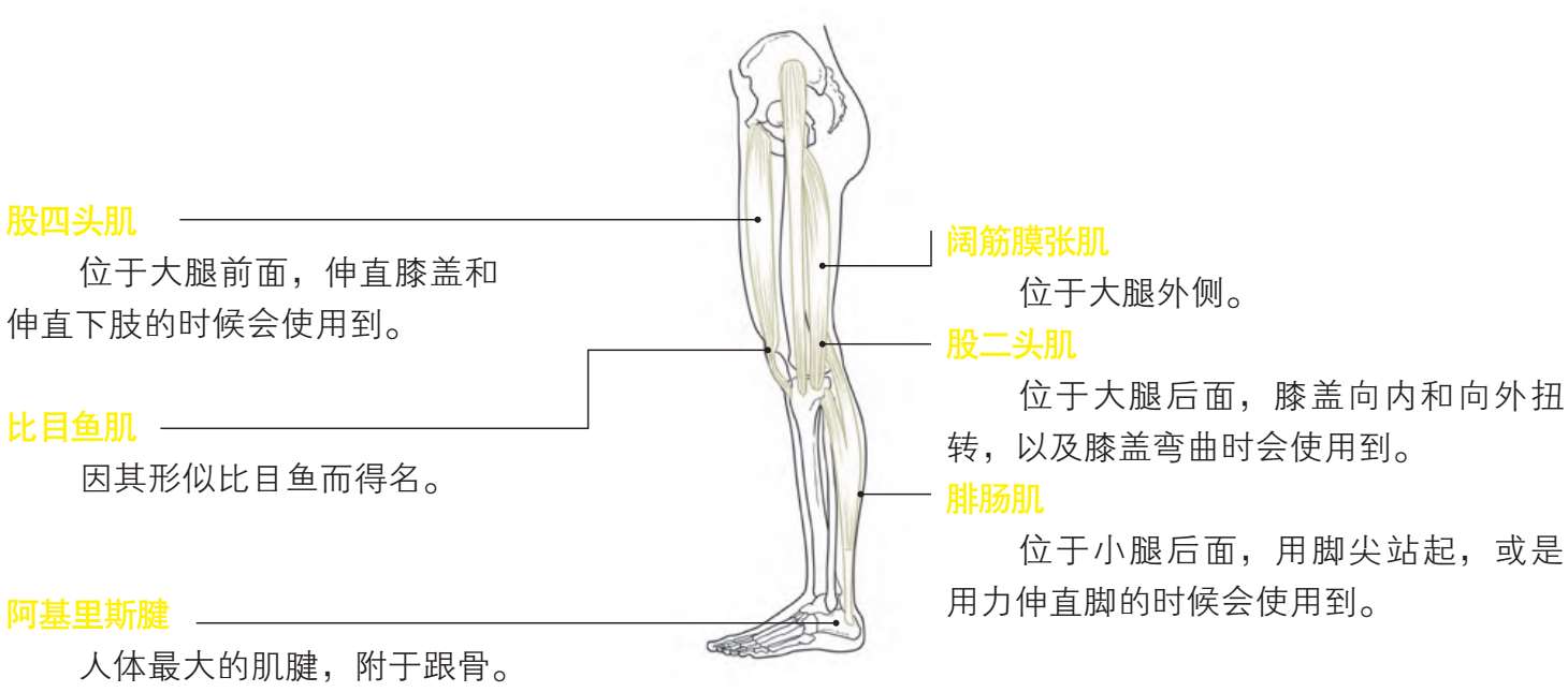 人体下肢的活动,离不开肌肉的参与,主要有股四头肌、腘旁肌群、腓肌。