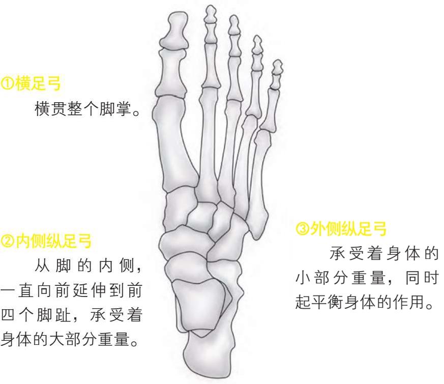 足弓由内侧纵足弓、外侧纵足弓、横足弓三个弓组成,它们各自对人体起着不同的作用。
