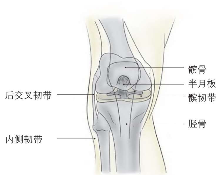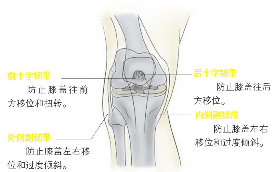 膝盖上有前十字韧带、后十字韧带、内侧副韧带和外侧副韧带四条粗的韧带。前十字韧带具有阻止下腿骨向前方移位、扭转的作用;后十字韧带具有阻止下腿骨向后移位的作用;内、外侧副韧带,在保护膝关节朝向侧方稳定性的同时,还具有固定半月板以控制膝盖的活动的作用。