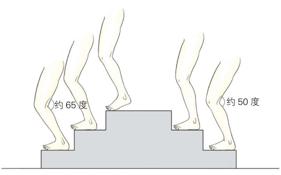 上楼梯时,膝盖平均弯曲50度;下楼梯时,膝盖平均弯曲65度。这个过程中会给膝盖增加约7倍体重的压力。