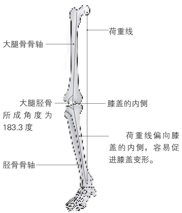 变形性膝关节症患者的80%以上是O型腿。正常的脚稍有X型倾向,从髋关节向脚踝以垂直向下的荷重线经过膝关节的中央,通过整个膝关节支撑身体。但O型腿的人的荷重线偏向内侧,对膝盖内侧形成强大的压力,使人体下肢失去重心和平衡,从而使膝关节的内侧磨损,引起变形。有O型腿的人,可以尝试步行法,以锻炼脚部的肌肉,对于缓解O型腿和预防变形性膝关节症很有好处。