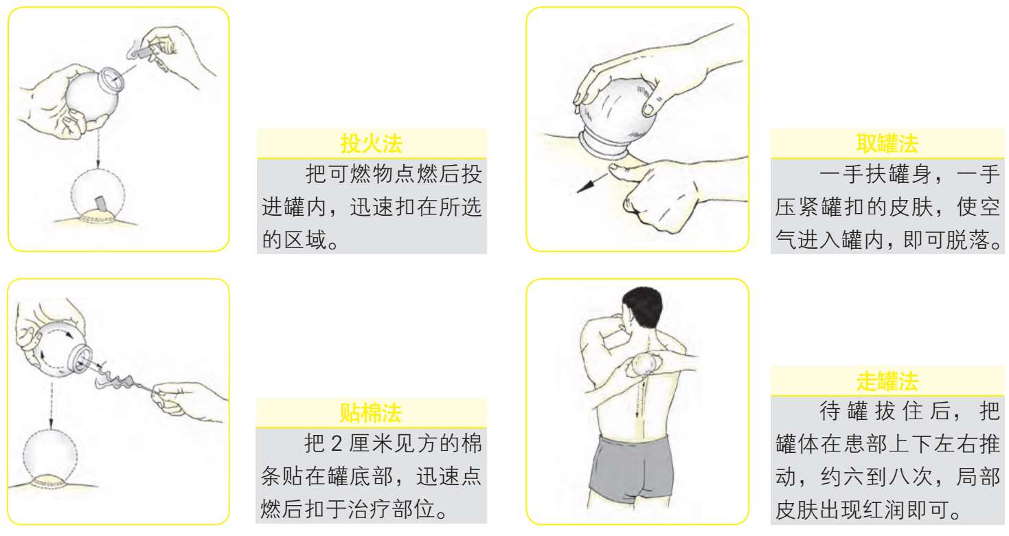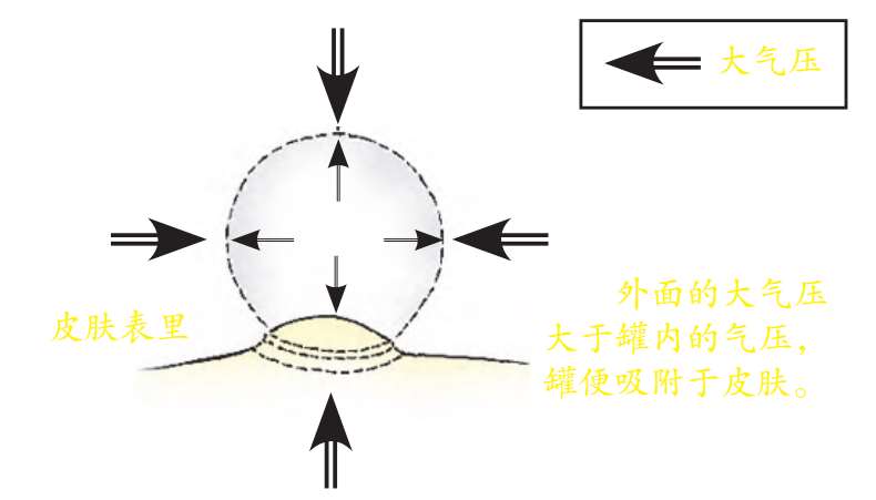 利用燃烧时产生的热力,排除罐内部分空气,造成负压(罐内气压低于外面大气压),使罐吸附于皮肤。