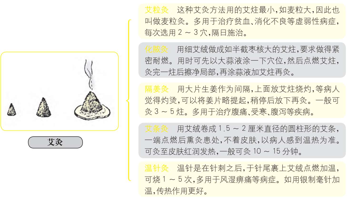 艾灸法是将艾绒置于体表穴位或患处烧灼施灸的方法,是中医最常用的一种治病方法,包括艾炷灸、艾条灸、艾饼灸、艾熏灸等4类。