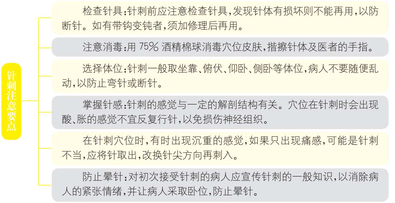 5.患者在过于饥饿、疲劳及精神紧张时,不宜立即进行针刺治疗。对身体瘦弱、气血亏虚的患者,应取卧位,针刺手法不宜过重。