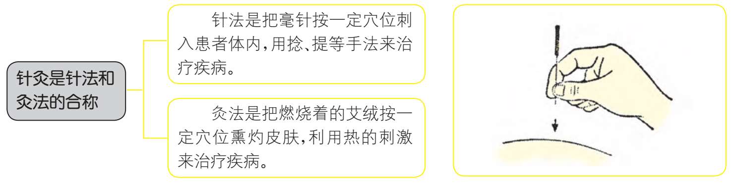 针灸是针法和灸法的合称。针法是把毫针按一定穴位刺入患者体内,用捻、提等手法来治疗疾病。灸法是把燃烧着的艾绒按一定穴位熏灼皮肤,利用温热的刺激来治疗疾病。