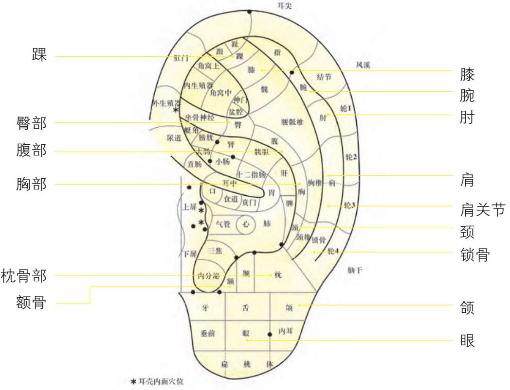 耳穴是指耳廓上一些特定的刺激点。耳穴在耳廓上的分布是有其一定的分布规律可循的,如下图所示: