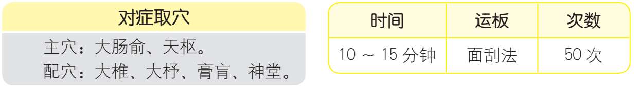 也可以选用刮痧疗法,选取大椎穴和天枢穴为主穴,选取大椎穴、膏肓穴、神堂穴为辅穴,采用面刮法,每穴刮拭50次左右。