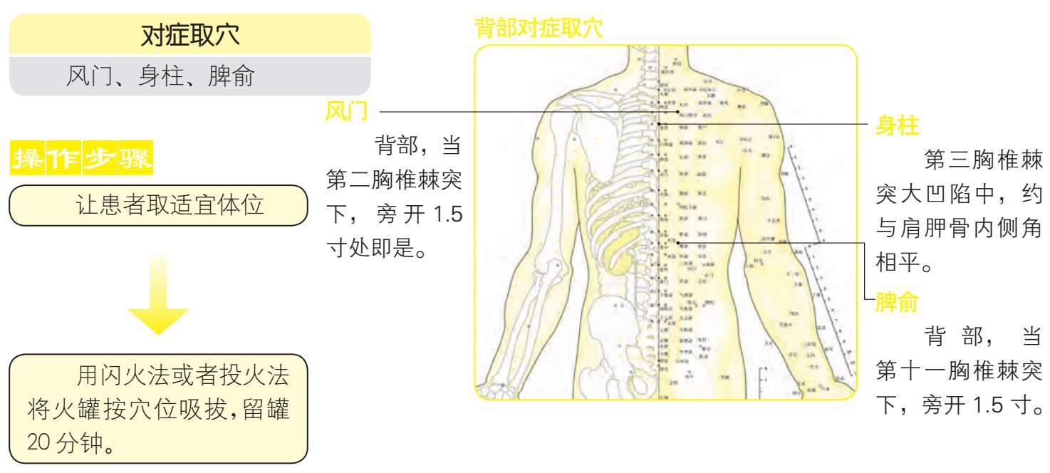 也可以选择拔罐疗法,选取风门穴、身柱穴、和脾俞穴,让患者取适宜体位,用闪火法或者投火法将火罐按穴位吸拔,留罐20分钟。每日1次。