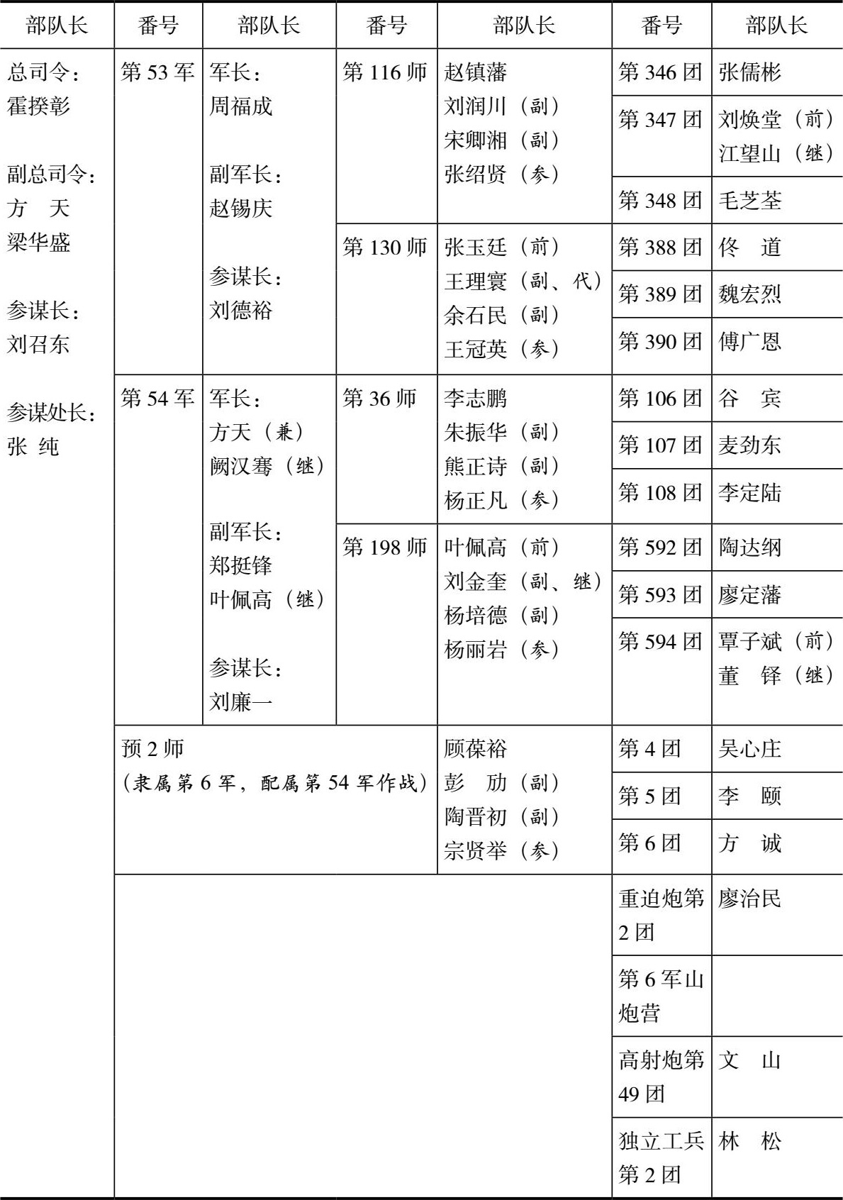 53军军长周福成,副军长李汉章(原是韩复榘老部下,派来后不久即离去),继任赵镇藩,参谋长刘德裕,副参谋长郭业儒;不久郭调任20集团军司令部参谋处副处长,由夏时继任副参谋长。第116师师长赵镇藩,副师长刘润川,参谋长张绍贤。赵镇藩升任副军长后,由刘润川升任师长,张绍贤升任副师长。师辖第346团,团长张儒彬;第347团,团长刘焕堂;第348团,团长毛芝荃。第130师师长张玉廷(又写作张玉珽),副师长王理寰,参谋长王冠英。反攻后,张玉廷因在江苴街战役中擅自退却,遭撤职处分,由王理寰升师长。师辖第388团,团长佟道;第389团,团长魏宏烈(魏在腾冲战后撤职,由王京山继任团长);第390团,团长傅广恩。