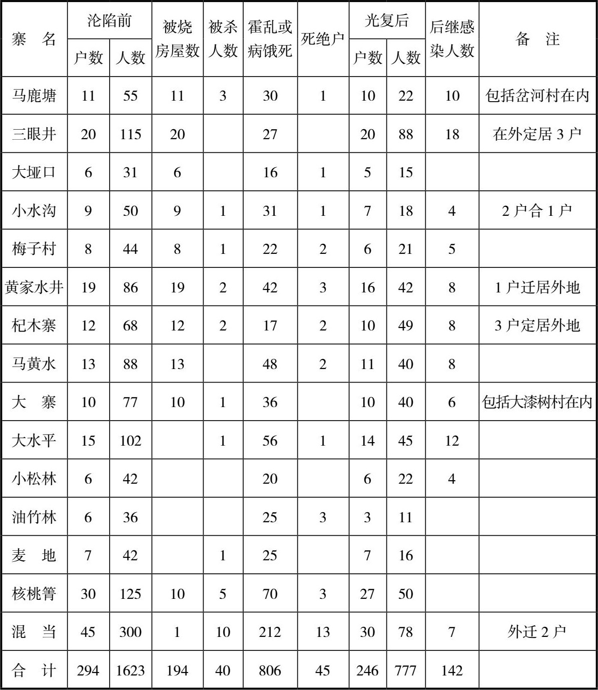 战后当地政府组织调查,松山附近17个自然村(寨)遭受日军战争罪行受害情况如表1所示: