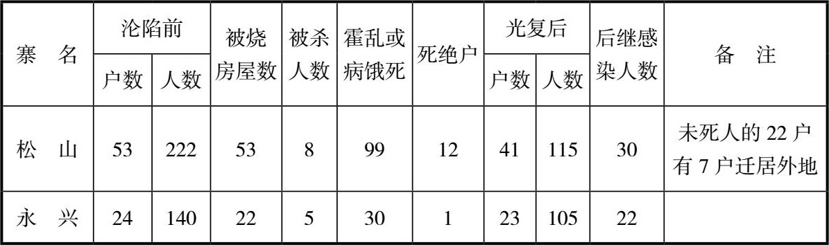 战后当地政府组织调查,松山附近17个自然村(寨)遭受日军战争罪行受害情况如表1所示: