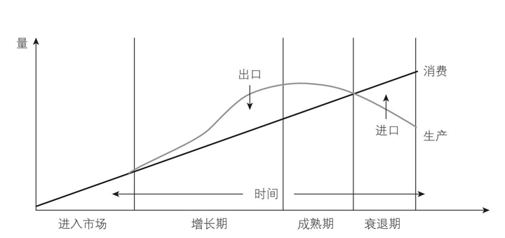 弗农认为,大多数新产品都是在本土生产并在本土市场消费的。新事物所带来的风险让企业策略变得谨慎,而且无论怎样,企业都没有必要把生产线迁移到国外来降低成本,因为顾客对新产品的最初需求不太可能取决于价格因素。在进入市场阶段,产品需求可能一开始主要局限在本土市场,但后来随着成本下降,向发达经济体出口产品可能会带来销量的增长。这轮增长在一开始可能不足以让企业在这些国家建立生产线,但是随着产品进入成熟期,情况会有所改变。在产品生命周期的最后阶段——衰退期,新产品在原产地的产量会下降,因为越来越多的国外生产线也能生产出同样优质的产品,并且成本更低。虽然产品需求会持续增长,但企业通过进口也能满足本土市场的部分需求。因此,弗农认为,从创新企业转型到出口企业并最终成长为进口企业的发展路线是有迹可循的,甚至是可预测的。