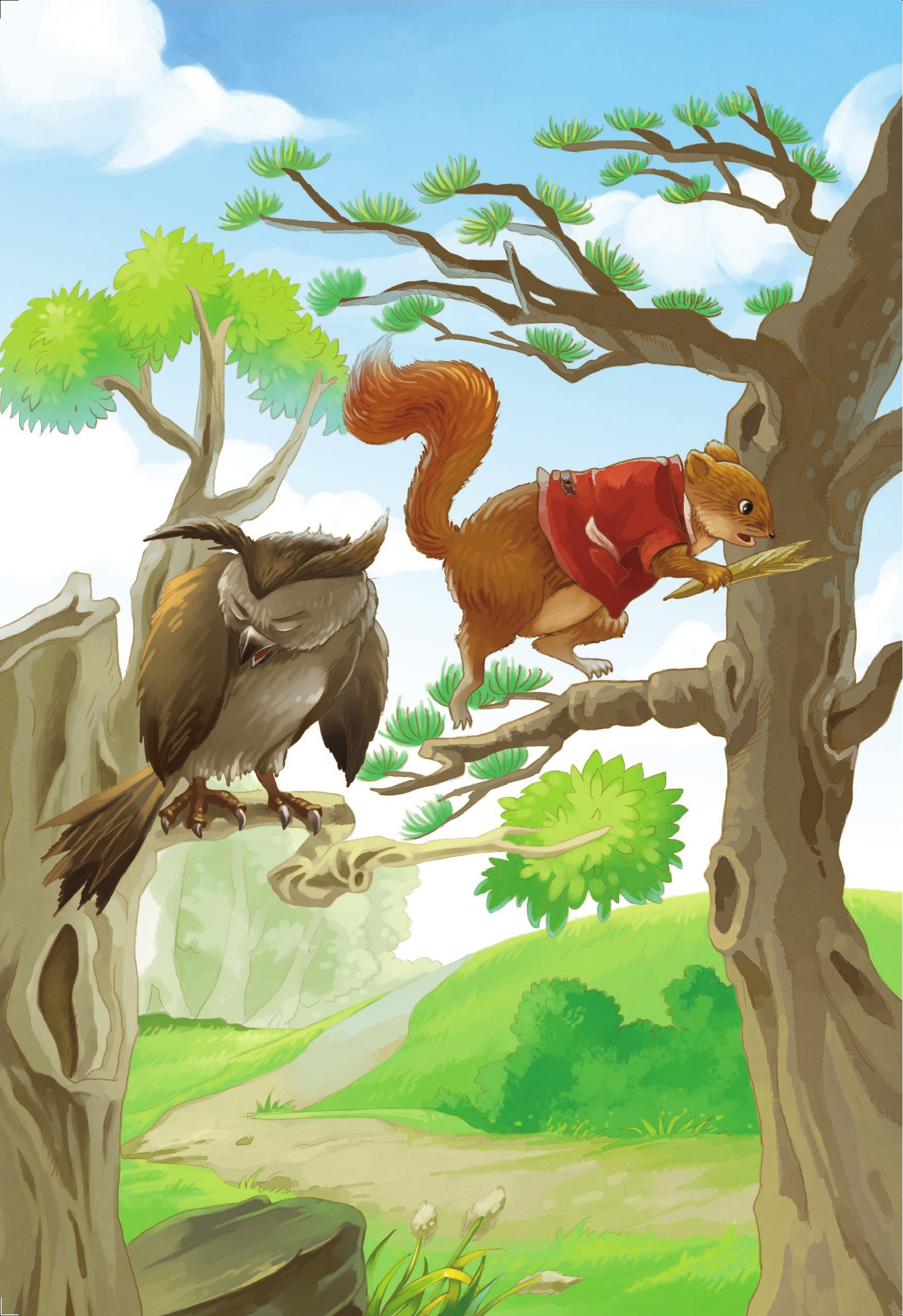 老鹰红尾巴也是一个能让红松鼠喳喳躲着走的家伙。他和鼬鼠山豆有着相似的胃口,没事儿总是惦记着抓只小松鼠来解解馋。红松鼠喳喳有好几次差一点儿就被老鹰红尾巴抓住,所以他非常害怕这个家伙。不过此刻,他正朝老鹰红尾巴打瞌睡的那棵大树玩儿命地飞奔。这又是为什么呢?原来,红松鼠喳喳看到老鹰红尾巴正在睡觉,不可能发现自己的行踪,才冒险做出了这么一个决定。红松鼠喳喳心里清楚,虽然老鹰红尾巴总惦记着吃小松鼠,然而鼬鼠山豆也是他的猎物之一。于是,红松鼠喳喳才大起胆子想出了这么一个主意。