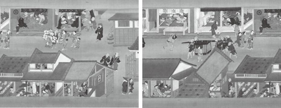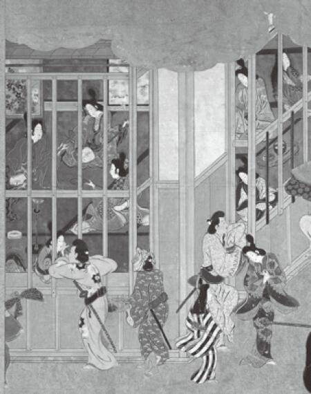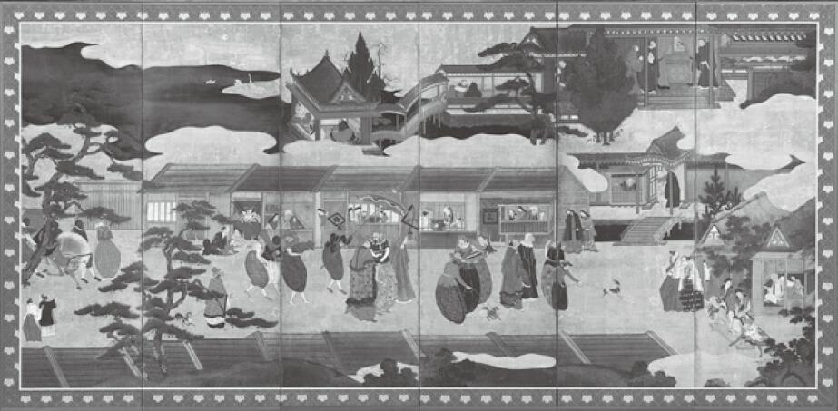《洛中洛外图卷》(江户时代)(局部)。古代日本首都平安京简称“洛阳”,京都市街洛中及洛外的名胜古迹、节令活动和生活场景,一览无遗地呈现在此画面上。