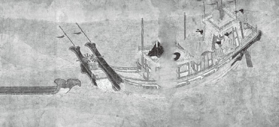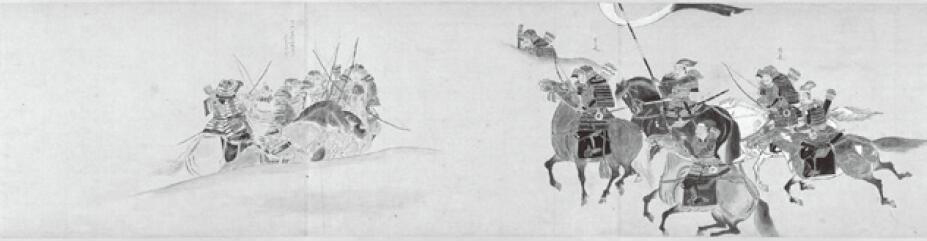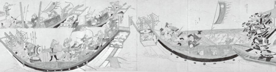 《蒙古袭来》绘词(局部)。元朝统治者忽必烈在1274年和1281年两次派军队入侵日本,第一次入侵称“文永之战”(上、中),第二次入侵称“弘安之战”(下)。