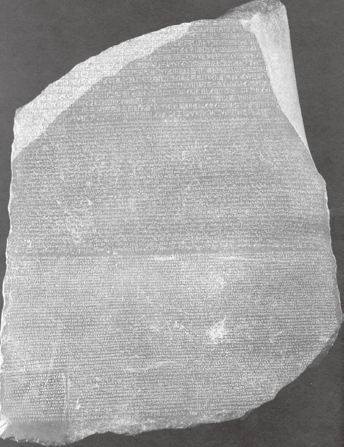 罗塞塔石碑,最上部为埃及象形文字,再下来的部分是通俗体文字,而希腊文字则是在最底端。