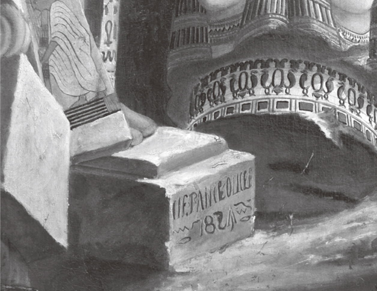 拿破仑殖民时期的一幅画《埃及纪念碑》的局部,纪念碑铭文的解读成功,使人们读懂古埃及象形文字。