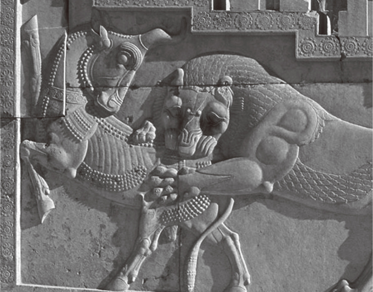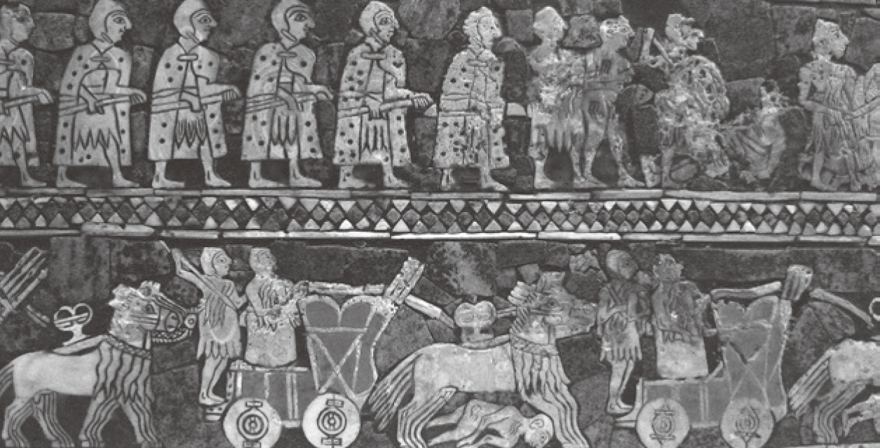 乌尔的石雕,以一连串的景象展现乌尔人处于战争或和平中的情景。在战争时,他们手持武器,驾着马拉的战车。