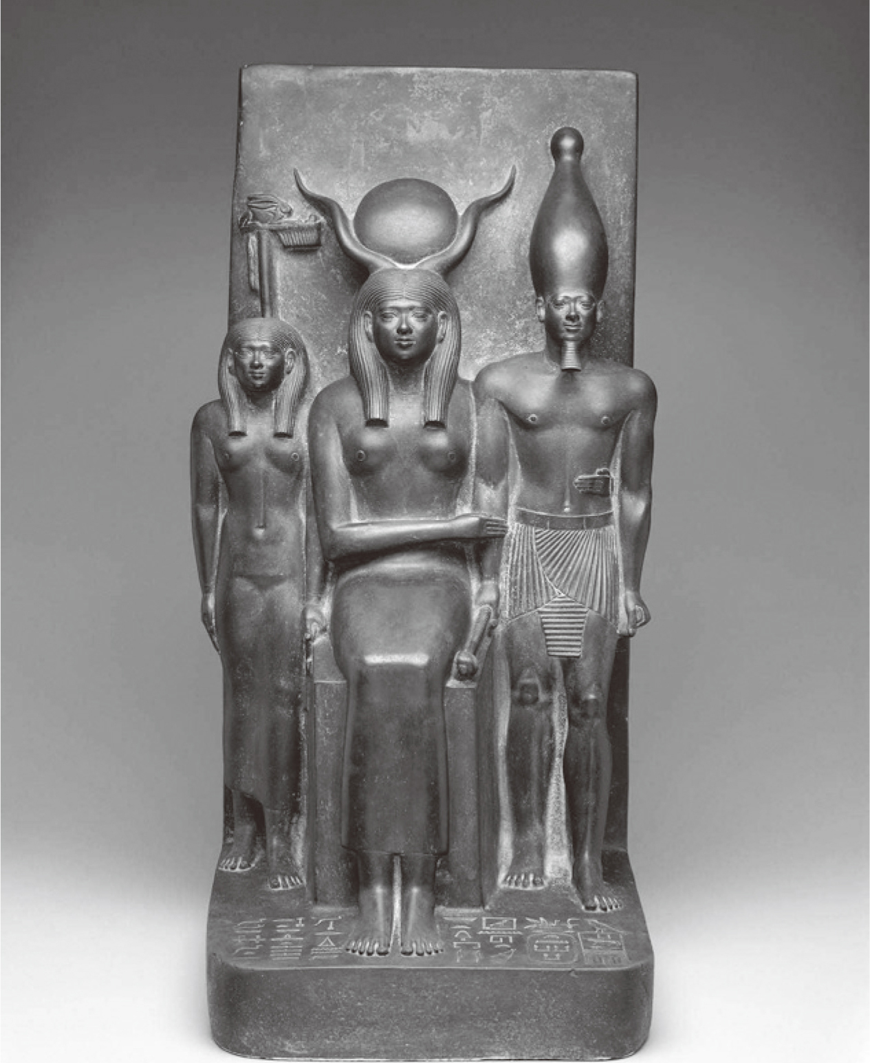 古埃及宗教的苍天女神哈托尔(中)和埃及第四王朝第五代(某些传统说法是第六代)国王门卡乌拉(右)