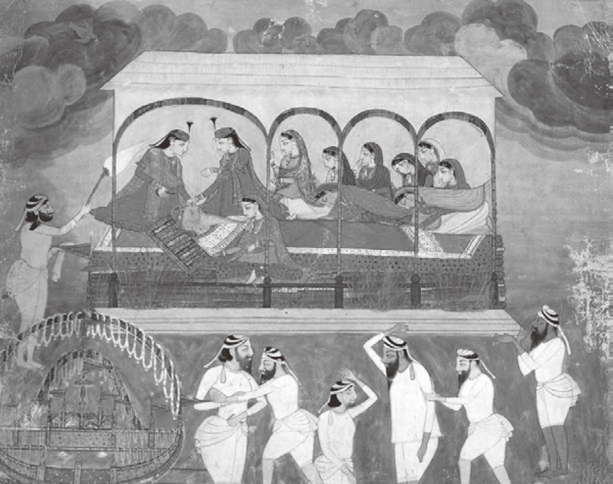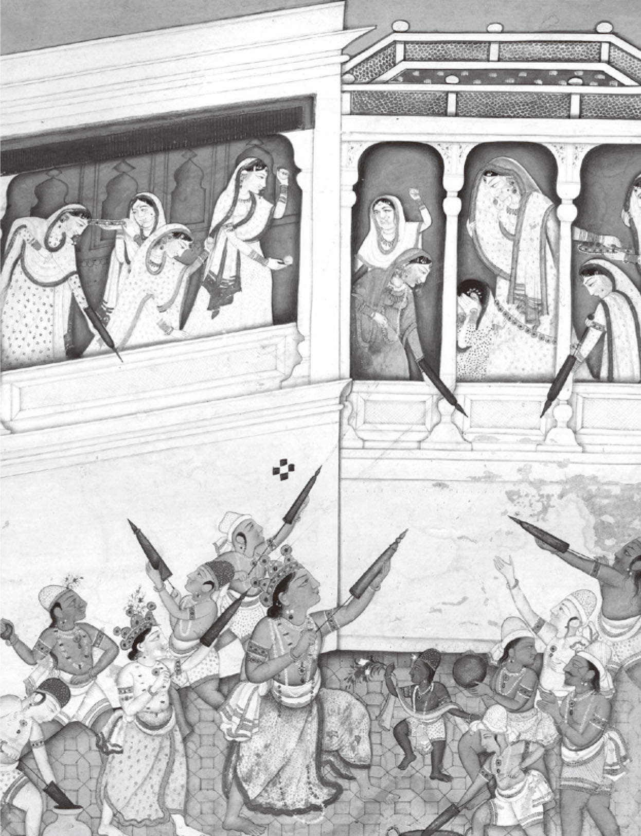 这幅画表现了旁遮普锡克王国的葬礼中寡妇随夫自焚的情形,这种旧俗在印度叫萨蒂。