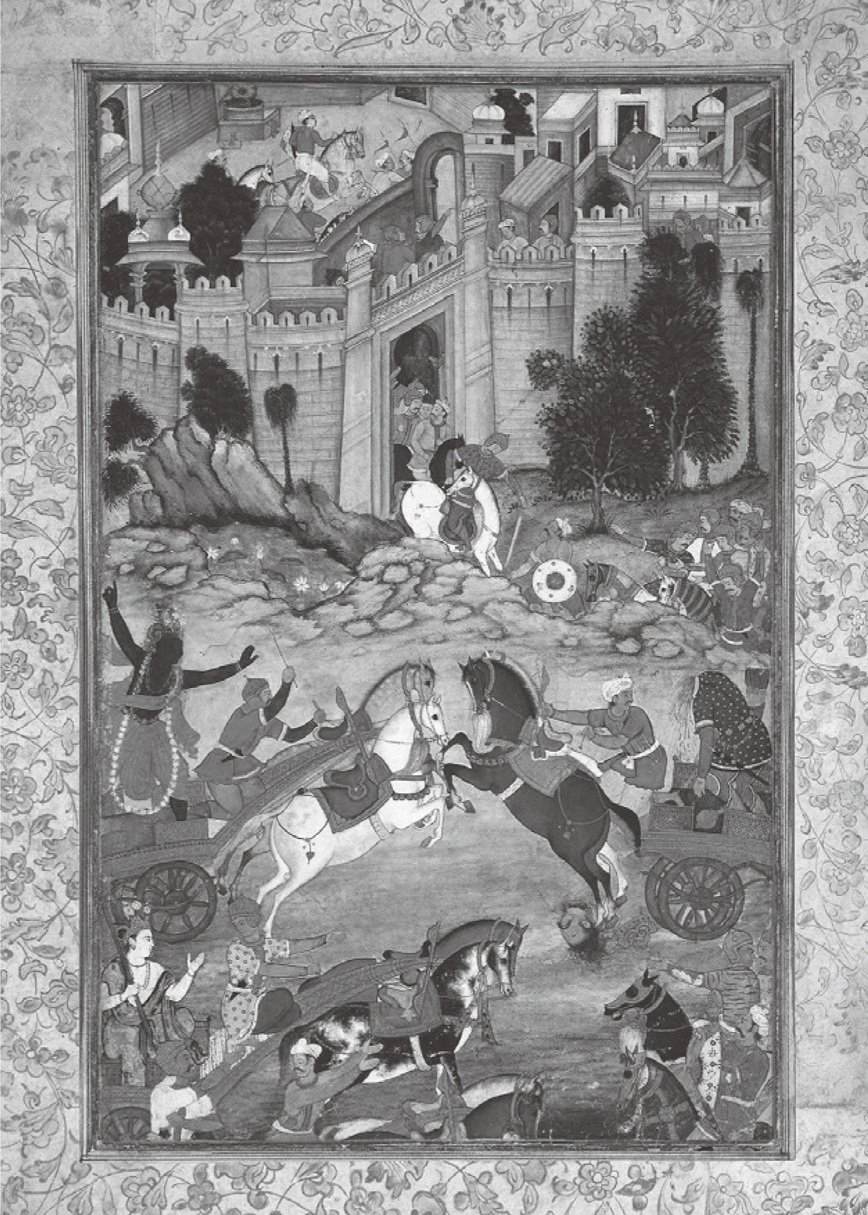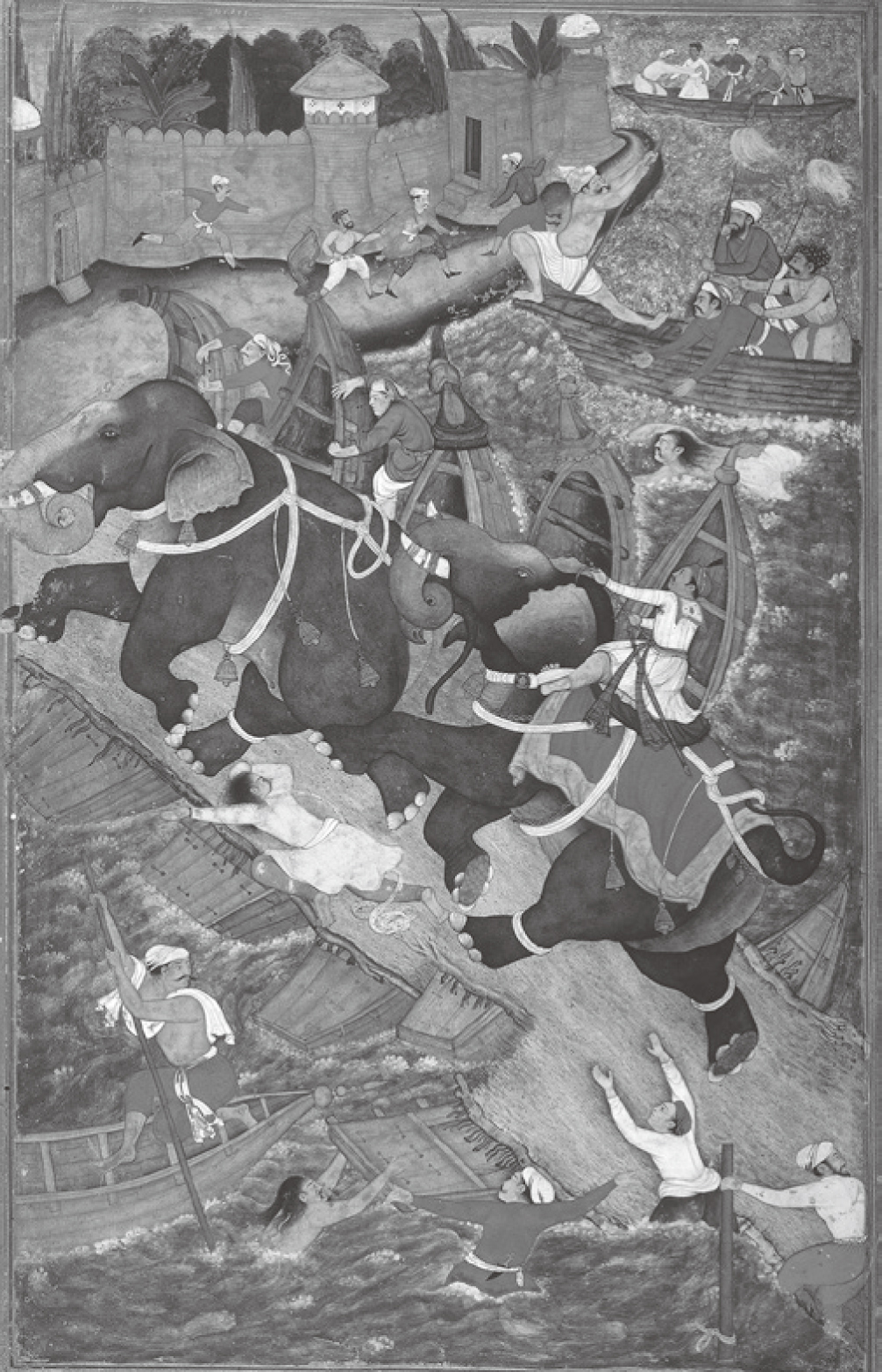 印度莫卧儿皇帝阿克巴驾着他的大象和另一只大象赛跑。