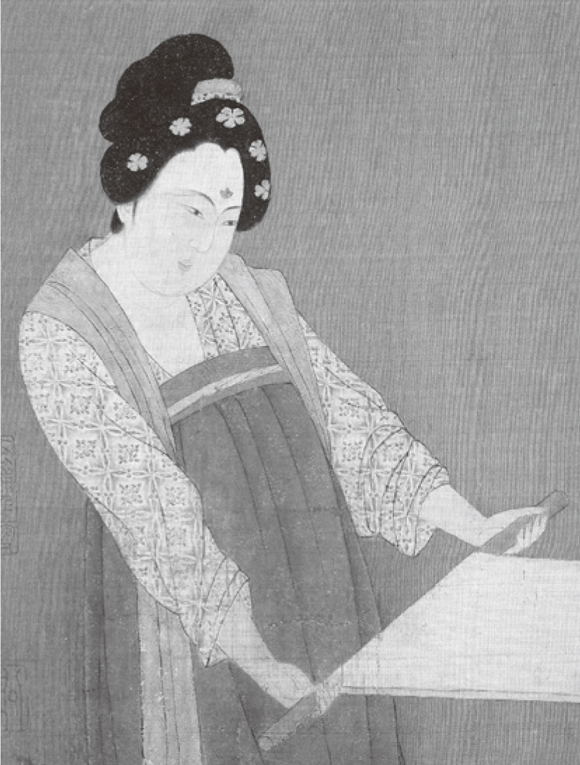 《摹张萱捣练图卷》(局部)(传宋徽宗)表现了贵族妇女捣练缝衣的工作场面。