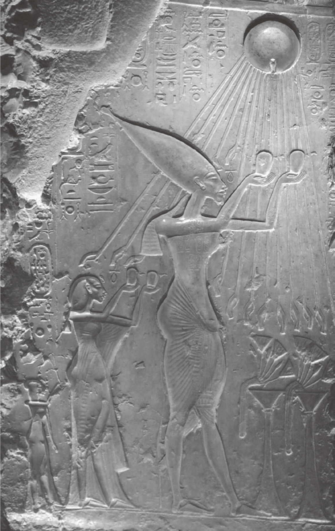 阿肯那顿和奈费尔提蒂带领3个女儿接受太阳神阿吞的光芒照射。