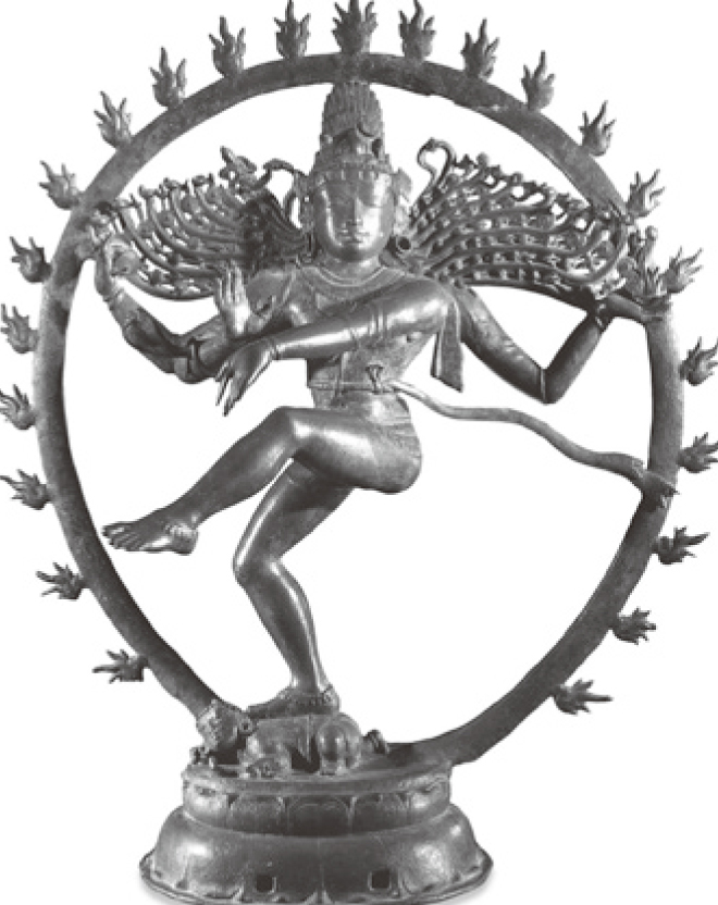 10至11世纪朱罗王朝的青铜雕塑等常见雕塑,都显示湿婆张开四臂,脚踏象征人类冥顽的侏儒舞蹈,长发飘荡。